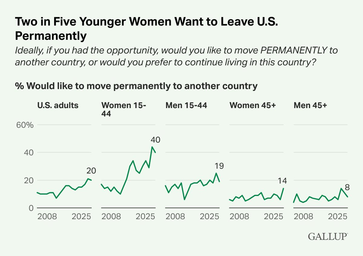 “Khoảng cách 21 điểm phần trăm giữa phụ nữ trẻ (40%) và nam giới trẻ (19%) muốn rời Mỹ là mức chênh lệch lớn nhất mà Gallup từng ghi nhận,” báo cáo cho biết.
