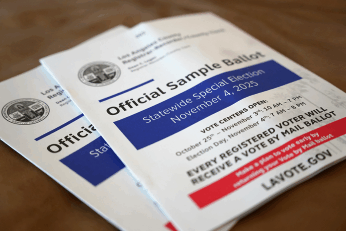 Một lá phiếu mẫu được chụp lại trước khi bắt đầu giai đoạn bỏ phiếu sớm trong cuộc bầu cử đặc biệt toàn tiểu bang California, ngày 3 tháng 10 năm 2025, tại Los Angeles. (Ảnh: AP/Paula Ulichney-Munoz)