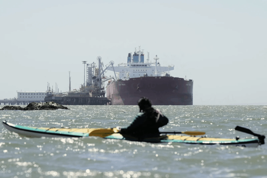 RICHMOND, California (AP) — Một chiếc tàu chở dầu đang neo đậu tại nhà máy lọc dầu Chevron ở Richmond, California hôm thứ Năm, là hình ảnh rõ ràng cho thấy mối liên kết giữa nhu cầu dầu từ rừng Amazon của California và những khu rừng nhiệt đới xa xôi nơi dầu được khai thác.