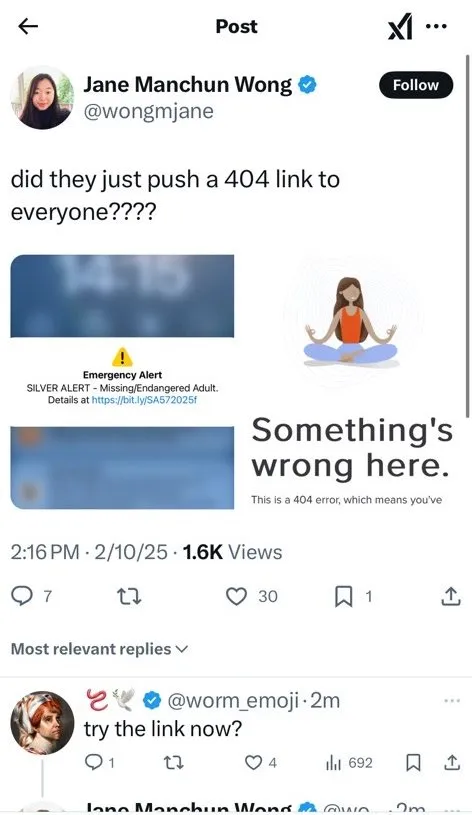 Tuy nhiên, sau khi nhấp vào liên kết, ban đầu người dùng sẽ được chuyển đến một trang web có “lỗi 404”. Vài phút sau, liên kết trong Silver Alert đưa người dùng đến một bài đăng X của Jane Manchun Wong (@wongmjane), trong đó có nội dung “họ vừa gửi liên kết 404 cho mọi người sao?????”