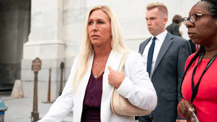 Dân biểu Marjorie Taylor Greene (Đảng Cộng hòa-Ga.) phát biểu với phóng viên khi bà rời Phòng Hạ viện sau cuộc bỏ phiếu cuối cùng trong ngày vào thứ Tư, ngày 10 tháng 9 năm 2025.