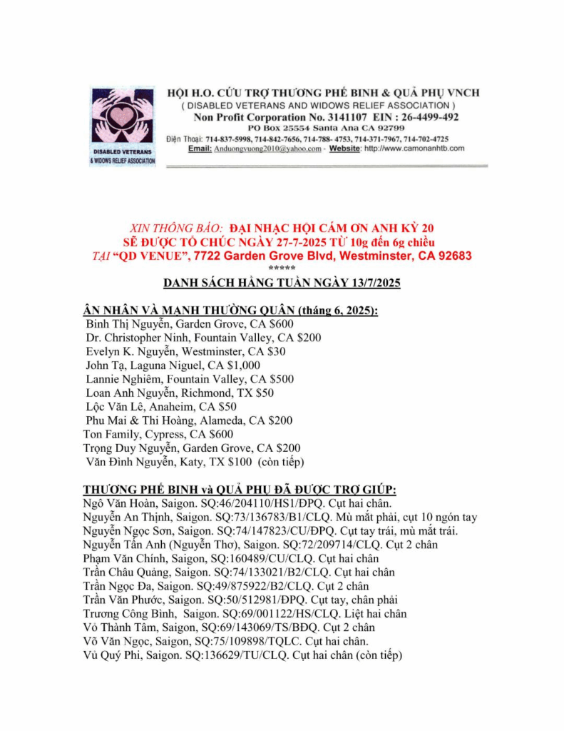 danh sách ân nhân gởi tiền cho Hội HO cứu trợ Thương Phế Binh hằng tuần – 13/7/2025