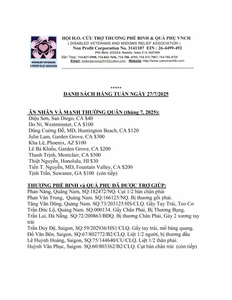 Danh sách ân nhân gởi tiền cho Hội HO cứu trợ Thương Phế Binh hằng tuần – 27/7/2025