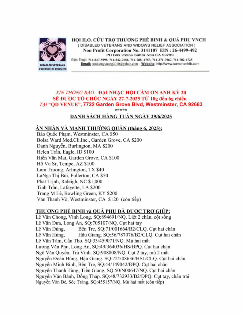 Danh Sách Ân Nhân Gởi Tiền cho Hội HO cứu trợ Thương Phế Binh hằng tuần – 29/6/2025