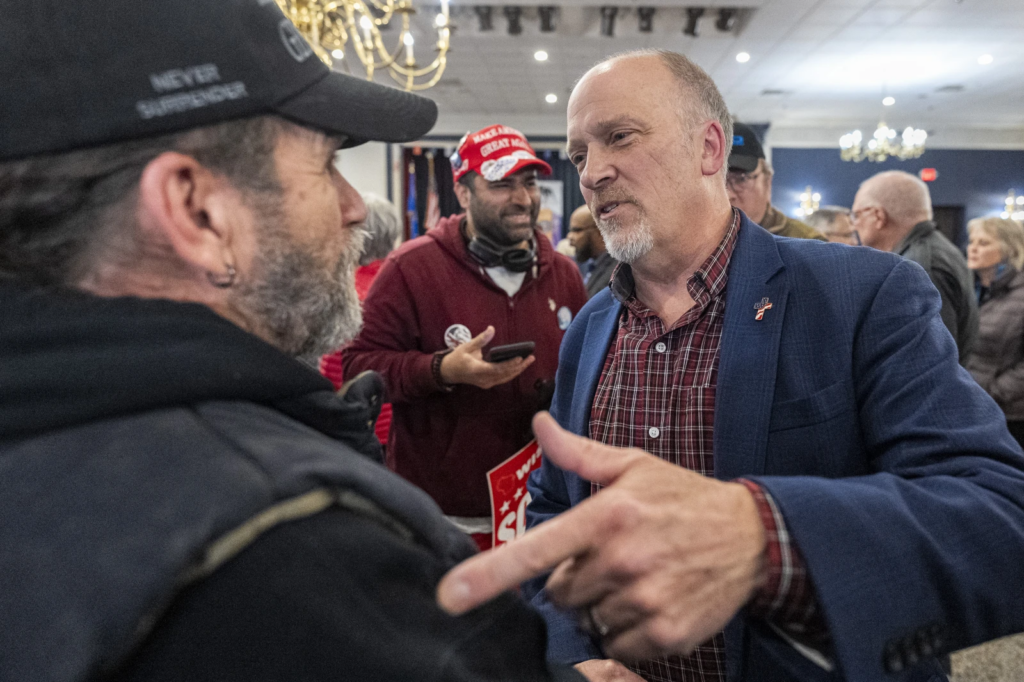 Ứng cử viên Tòa án Tối cao Wisconsin Brad Schimel, bên phải, đang nói chuyện với người ủng hộ sau cuộc biểu tình vào thứ Bảy, ngày 29 tháng 3 năm 2025 tại điểm dừng chân vận động tranh cử tại American Serb Memorial Hall ở Milwaukee. (Ảnh AP/Andy Manis)