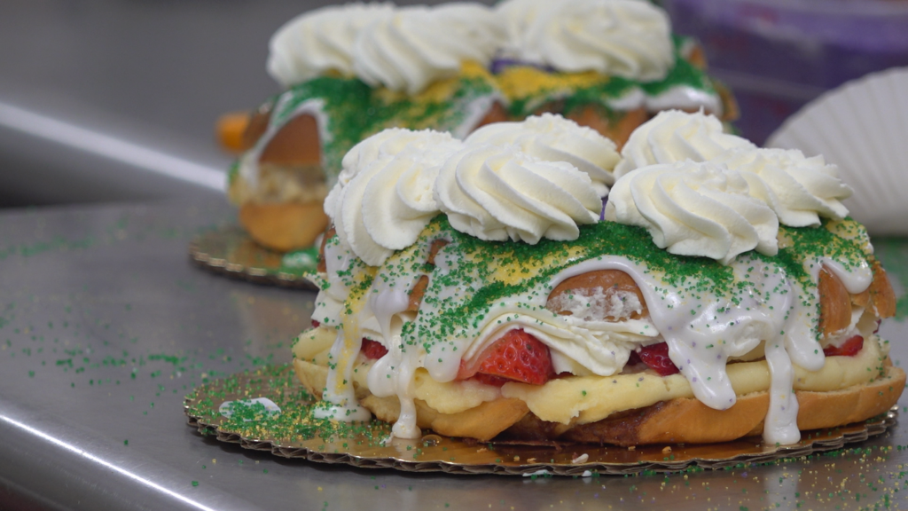 Jean-Luc Albin, chủ tiệm Maurice French Pastries ở Metairie, Louisiana, cho biết mùa Mardi Gras là thời điểm bận rộn nhất trong năm, với hơn 100 chiếc king cake được làm ra mỗi ngày.