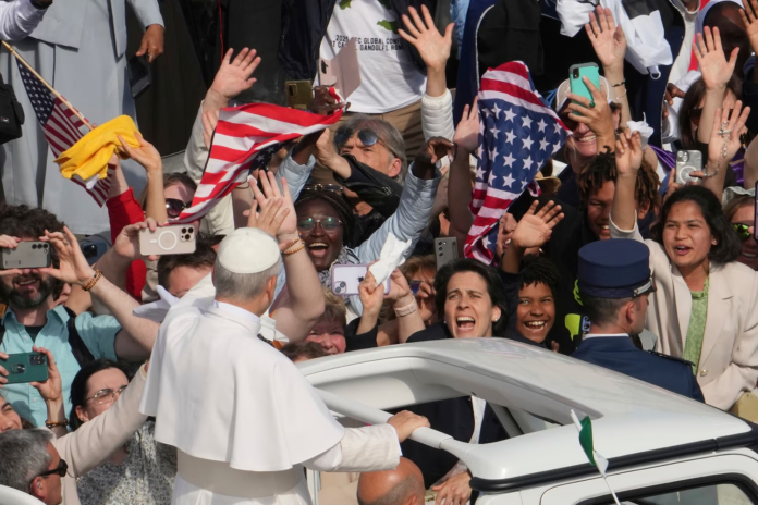 Đức Giáo hoàng Leo XIV trên xe popemobile tham quan Quảng trường Thánh Peter tại Vatican trước Thánh lễ khai mạc triều đại giáo hoàng của ngài, Chủ Nhật, ngày 18 tháng 5 năm 2025.