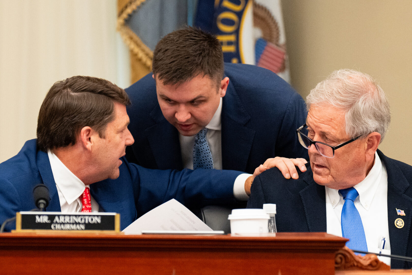 Chủ tịch Ngân sách Jodey C. Arrington, R-Texas, bên trái, phát biểu với nhân viên và Dân biểu Ralph Norman, RS.C., trong phiên họp đánh dấu dự luật hòa giải của Ủy ban Ngân sách Hạ viện vào thứ sáu. ( Bill Clark/CQ Roll Call )