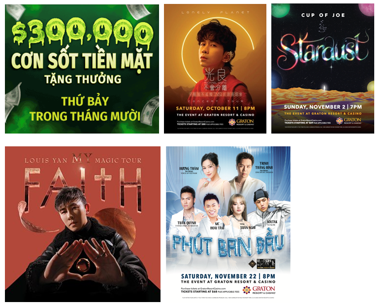 Graton Resort & Casino, tọa lạc tại Rohnert Park, California, là tụ điểm hàng đầu để giải trí, ăn uống và chơi bài ở Bắc California. Tự hào với bầu không khí sang trọng và tiện nghi mang đẳng cấp thế giới, Graton Resort & Casino mang đến cho du khách những trải nghiệm tuyệt vời với nhiều sự lựa chọn nhà hàng, quán bar, trò chơi khác nhau và các địa điểm giải trí trực tiếp. Từ các sinh hoạt chơi bài thú vị đến ăn uống cao cấp và trị liệu spa thư giãn, Graton Resort & Casino cung cấp một nơi nghỉ dưỡng toàn diện cho du khách muốn tìm kiếm sự phấn khích và thư giãn. Quyền tham dự vào khu nghỉ dưỡng được giới hạn cho khách từ 21 tuổi trở lên. Để biết thêm thông tin, vui lòng truy cập www.gratonresortcasino.com.