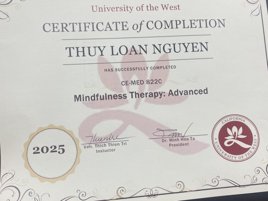 Chứng chỉ tốt nghiệp khóa Thiền của Đại học University of The West.