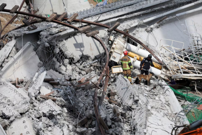 Các nhân viên cứu hộ tham gia vào hoạt động cứu hộ tại một công trường xây dựng đường cao tốc bị sập ở Cheonan, Hàn Quốc, ngày 25 tháng 2 năm 2025. REUTERS/Kim Hong-ji