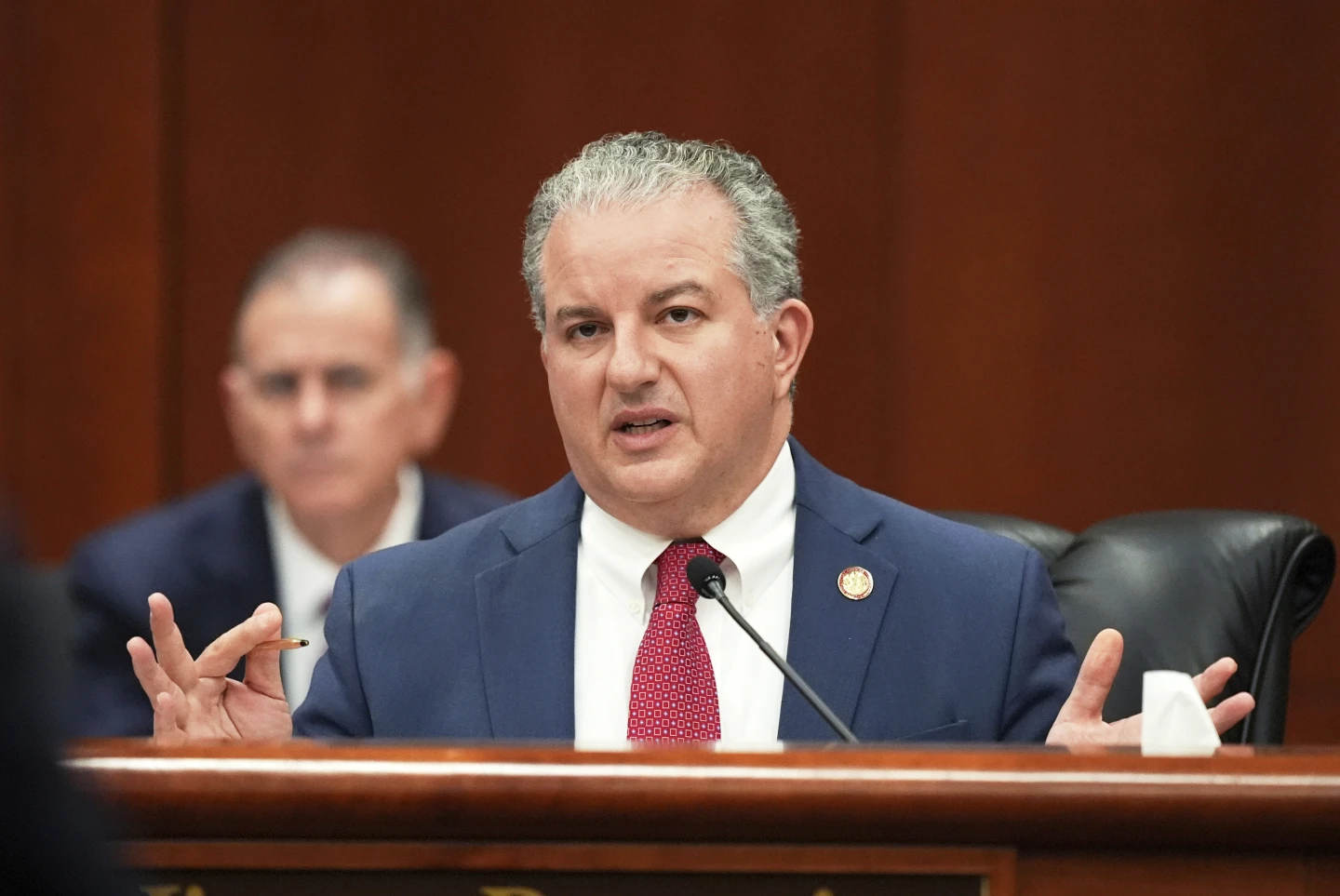 Giám đốc tài chính Florida Jimmy Patronis phát biểu trong cuộc họp giữa Thống đốc Ron DeSantis và nội các tiểu bang tại tòa nhà quốc hội Floridaở Tallahassee, Fla., vào ngày 5 tháng 3 năm 2025. (Ảnh AP/Rebecca Blackwell, File)