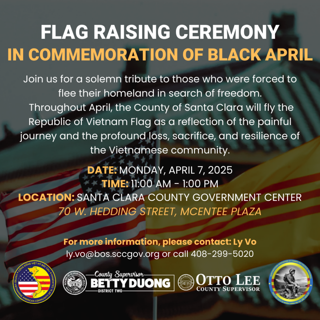 Thay mặt Quận Hạt Santa Clara, Chủ Tịch Hội Đồng Giám Sát Otto Leevà Giám Sát Viên Betty Dương trân trọng kính mời quý vị đến tham dự buổi Lễ Thượng Kỳ tưởng niệm 50 năm Tháng Tư Đen do Cộng Đồng Việt Mỹ Bắc Cali; Hội Cựu Tù Nhân Chính Trị Tây Bắc Hoa Kỳ phối hợp với Quận Hạt Santa Clara tổ chức vào: