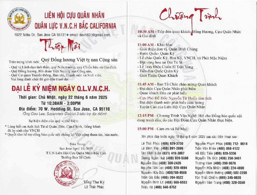 Hải Quân Thiếu Úy Lê Thái Phúc là Tổng Thư Ký của Liên Hội Cựu Quân Nhân Quân Lực VNCH Bắc California kính mời tất cả các đồng hương người Việt tỵ nạn Cộng Sản cùng quý thanh niên nam nữ hậu duệ của Quân Lực VNCH đến tham dự thật đông đảo đại lễ kỷ niệm 60 năm ngày Quân Lực VNCH 19 tháng 6 và sẽ được tổ chức lúc 10:30 AM sáng Chủ Nhật 22/6/2025 tại TIỀN ĐÌNH QUẬN HẠT SANTA CLARA số 70 W. Hedding St, San Jose, CA 95110.