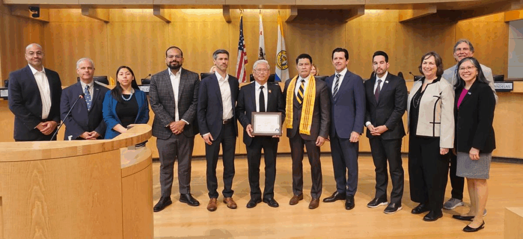 Tổng Thư Ký Lê Thái Phúc đứng chính giữa cầm bằng tưởng lục do Hội Đồng Thành Phố San Jose trao tặng