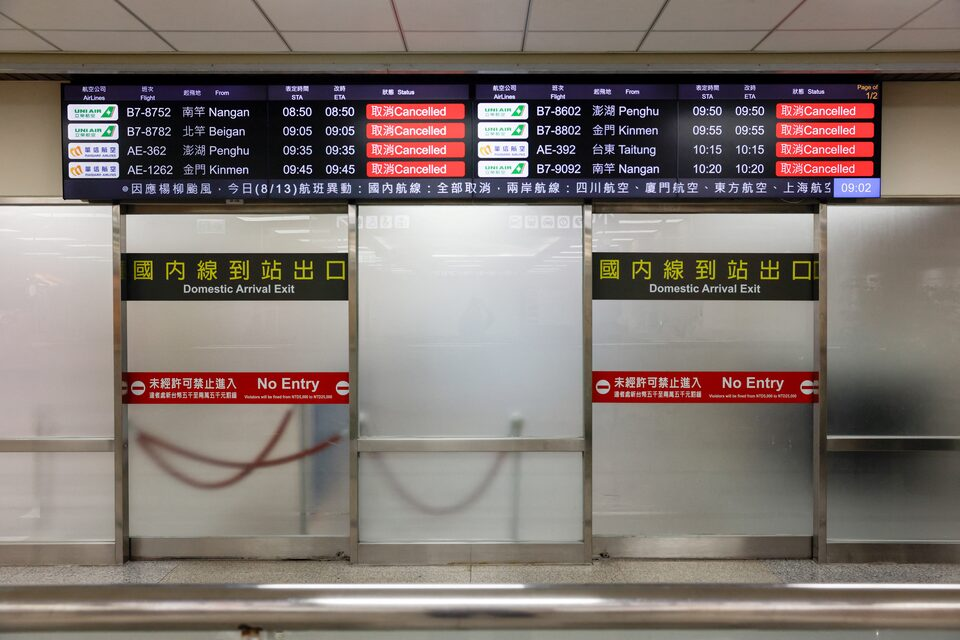 Màn hình hiển thị thông tin về các chuyến bay nội địa bị hủy khi bão Podul tiến gần đến đất nước này, tại Đài Bắc, Đài Loan ngày 13 tháng 8 năm 2025. REUTERS/Ann Wang Mua quyền cấp phép