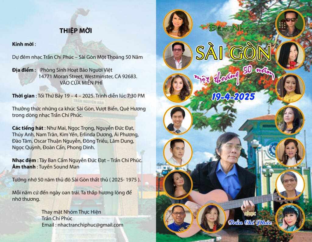 Đêm nhạc Sài Gòn Một Thoáng 50 Năm sẽ trình diễn đúng 7 giờ 30, Tối Thứ Bảy, 19-4-2025 tại Phòng Sinh Hoạt Báo Người Việt, 14771 Moran St, Westminster, CA 92683. VÀO CỬA MIỄN PHÍ.