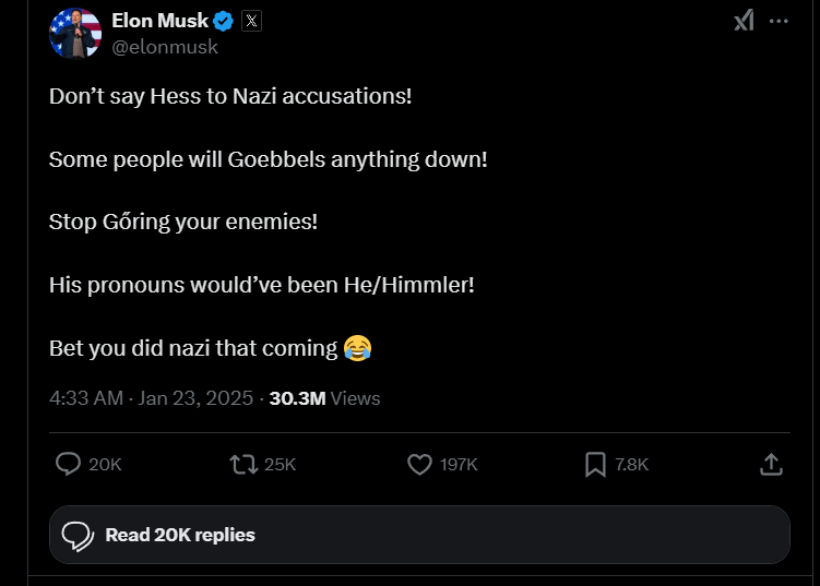 Elon Musk đã nhắc đến Adolf Hitler và các nhà lãnh đạo Đức Quốc xã khác trong một bài đăng trên mạng xã hội đầy những câu chơi chữ vào sáng thứ năm, chế giễu những người cáo buộc ông chào theo kiểu Đức Quốc xã tại một sự kiện sau lễ nhậm chức của Tổng thống Trump.