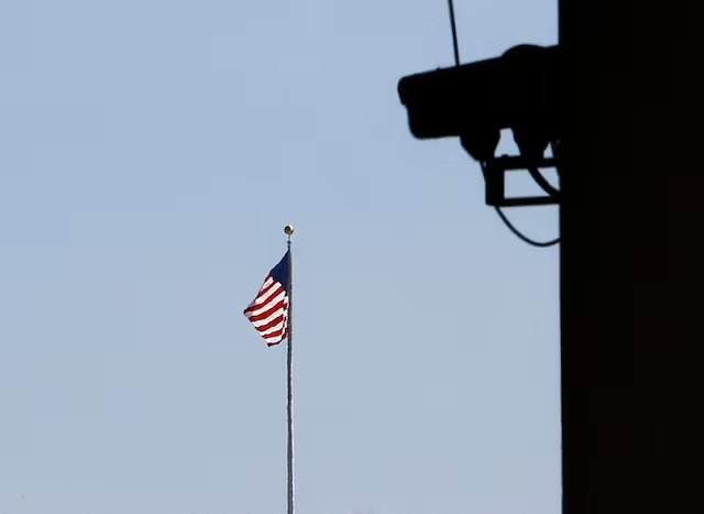 Một lá cờ Mỹ được nhìn thấy gần camera an ninh từ Tòa án Liên bang E. Barrett Prettyman ở Washington, Hoa Kỳ, ngày 5 tháng 9 năm 2023. REUTERS/Julia Nikhinson Mua Quyền Cấp Phép