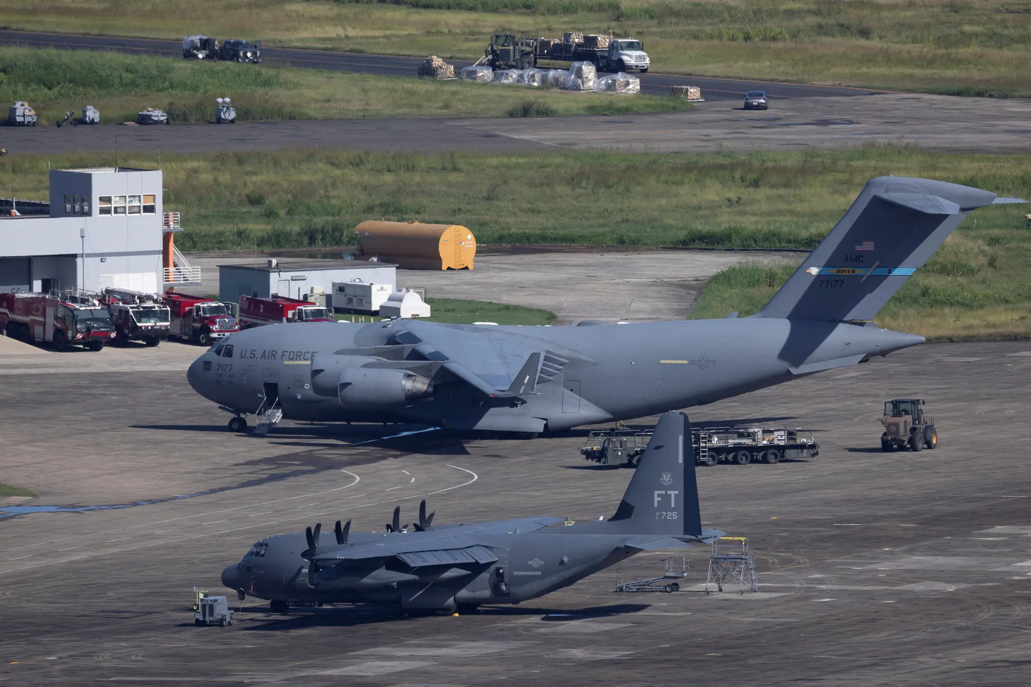 Tuần trước, các nhân viên mặt đất đã dỡ hàng từ máy bay C-17 Globemaster III của Không quân Hoa Kỳ (ảnh trên), đậu cạnh máy bay HC-130 của Không quân Hoa Kỳ, tại căn cứ hải quân Roosevelt Roads ở Ceiba, Puerto Rico.Tín dụng...Ricardo Arduengo/Reuters