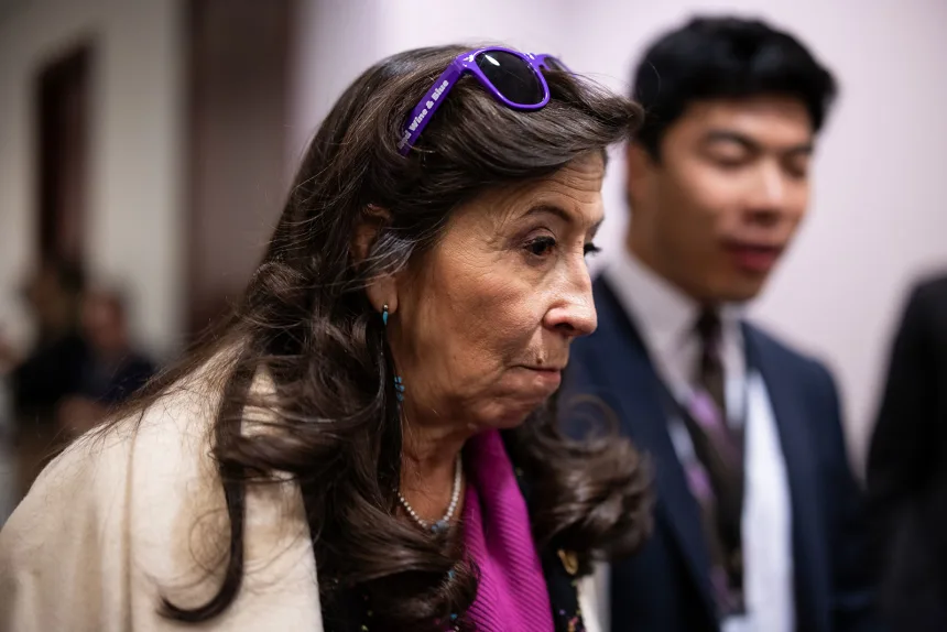 Dân biểu Teresa Leger Fernandez trò chuyện với phóng viên khi rời khỏi cuộc họp của nhóm nghị sĩ Dân chủ Hạ viện tại Đồi Capitol vào ngày 12 tháng 11.