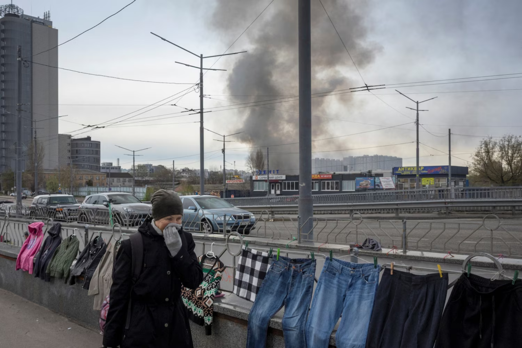 Một người phụ nữ che mũi khi đi bộ khi khói bốc lên từ địa điểm gần đó xảy ra cuộc tấn công bằng tên lửa của Nga tại Kyiv, Ukraine, vào ngày 6 tháng 4 năm 2025.
