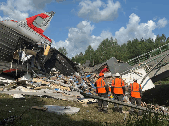 Các chuyên gia của dịch vụ khẩn cấp làm việc tại hiện trường, sau khi một cây cầu đường bộ sụp xuống đường ray xe lửa do vụ nổ ở vùng Bryansk, Nga, ngày 1 tháng 6 năm 2025. REUTERS/Stringer Quyền cấp phép mua