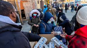 Mọi người khoác áo ấm chống lại cái lạnh và gió khi đứng chờ bên ngoài một nhà hàng ở Harlem, kiên nhẫn đợi để nhận một hộp trứng. Chưa đầy 10 phút sau, 100 hộp trứng đã được phát hết, khiến nhiều người ra về tay trắng.