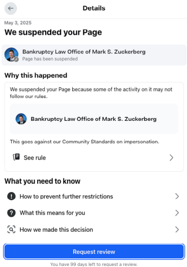 Zuckerberg, một luật sư tại Văn phòng Luật Phá sản của Mark S. Zuckerberg, đã tuyên bố rằng cả trang cá nhân và trang kinh doanh của anh đều bị ảnh hưởng do bị vô hiệu hóa — ngay cả sau khi anh đã trả tiền cho các dịch vụ quảng cáo trên trang kinh doanh của mình.
