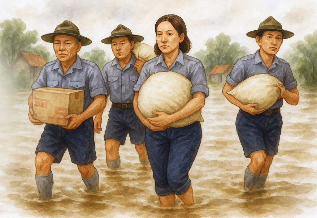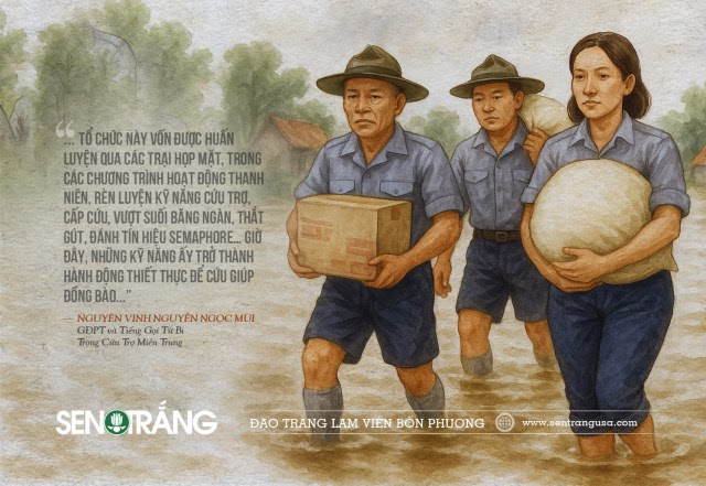 After the waters recede, the devastation is stark: houses collapse, thatched roofs are swept away, possessions are lost, and countless families are left destitute in the cold of winter. Amid this tragic landscape, the image of the Vietnamese Buddhist Youth Association (Gia Đình Phật Tử Việt Nam) emerges as a beacon of compassion and social responsibility. Trained through camps, youth development programs, and exercises in first aid, rescue techniques, river-crossing, knot-tying, and semaphore signaling, their skills now become vital actions in service of those in need.
