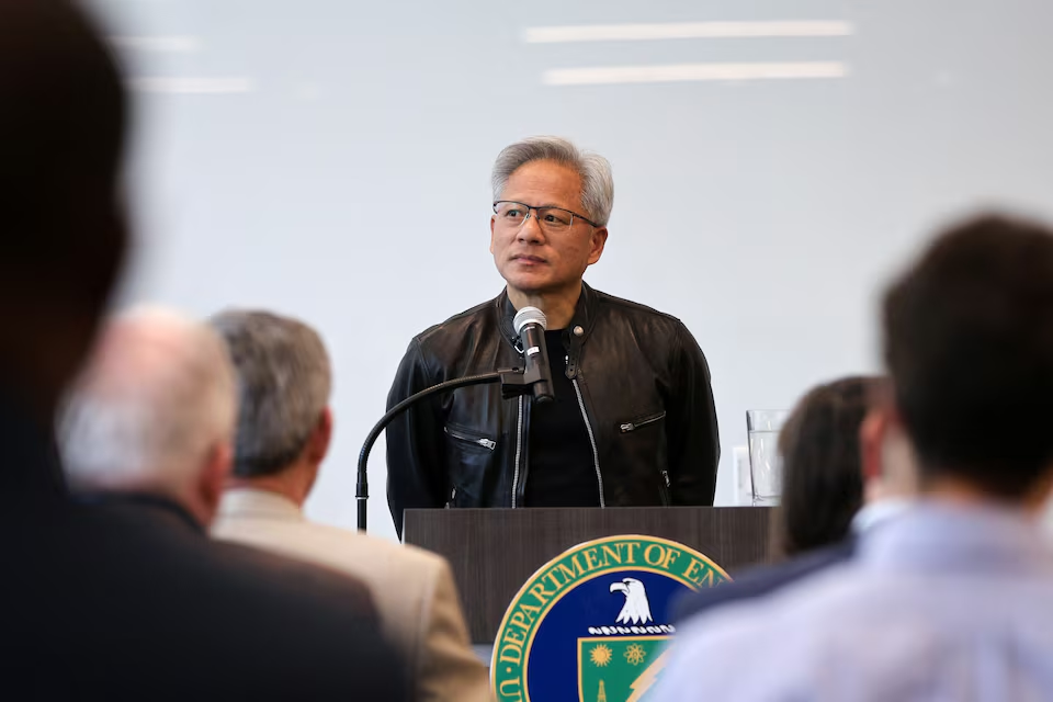 Tổng giám đốc điều hành Nvidia Jensen Huang phát biểu khi đến thăm Phòng thí nghiệm quốc gia Lawrence Berkeley để công bố siêu máy tính của Hoa Kỳ sẽ được cung cấp năng lượng bởi chip Vera Rubin sắp ra mắt của Nvidia, tại Berkeley, California, Hoa Kỳ, ngày 29 tháng 5 năm 2025. REUTERS/Manuel Orbegozo Mua quyền cấp phép