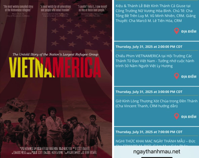 Phim VIETNAMERICA sẽ được chiếu vào lúc 2 giờ chiều, thứ Năm ngày 31 tháng 7, 2025, tại Hội Trường Các Thánh Tử Đạo Việt Nam, trong khuôn viên của tỉnh dòng Đồng Công trong Ngày Thánh Mẫu 2025.