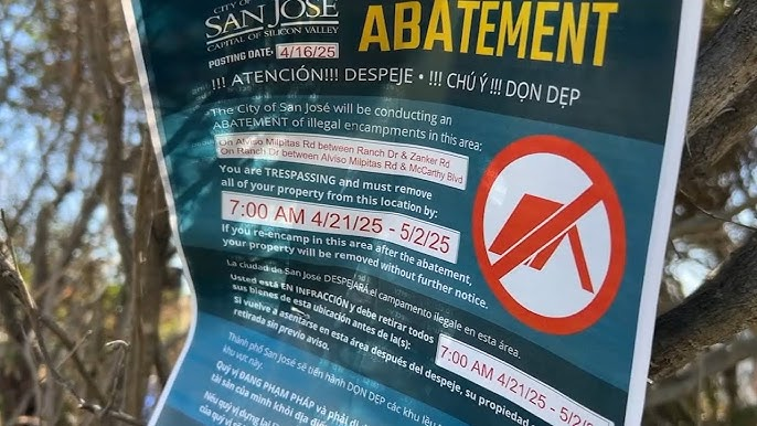 Các thông báo giảm thiểu được dán trên phố vào Chủ Nhật khi thành phố chuẩn bị cho một cuộc trục xuất hàng loạt. Cuộc truy quét này là cuộc đàn áp mới nhất của Thành phố San Jose đối với cư dân vô gia cư.