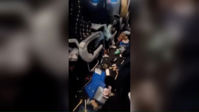Video do hành khách ghi lại cho thấy khung cảnh hỗn loạn trên máy bay, với khay ăn, đồ ăn và các vật dụng khác văng khắp sàn máy bay.