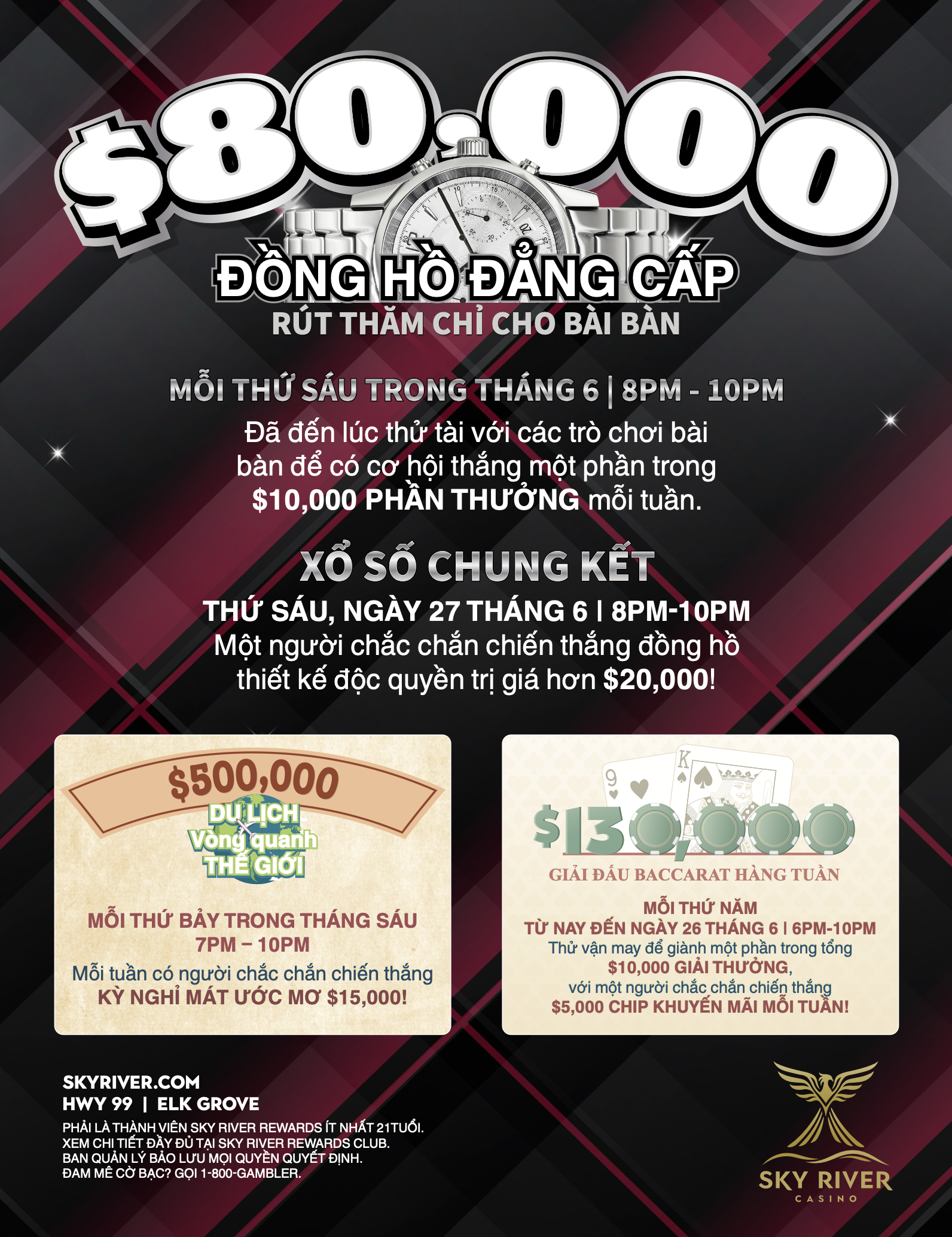 Elk Grove, CA – Sky River Casino chuẩn bị biến tháng Sáu trở thành một tháng đáng nhớ với loạt chương trình khuyến mãi ấn tượng, tổng giá trị giải thưởng lên đến hơn $710,000. Điểm đến chơi game hàng đầu tại Bắc California sẽ giới thiệu Chương Trình Rút Thăm “Đồng Hồ Đẳng Cấp” trị giá $80,000 chỉ cho các Trò Chơi Bài Bàn, Chương trình Biếu Tặng “Du Lịch Vòng Quanh Thế Giới” trị giá $500,000, và các Giải Đấu Baccarat hàng tuần trị giá $130,000.