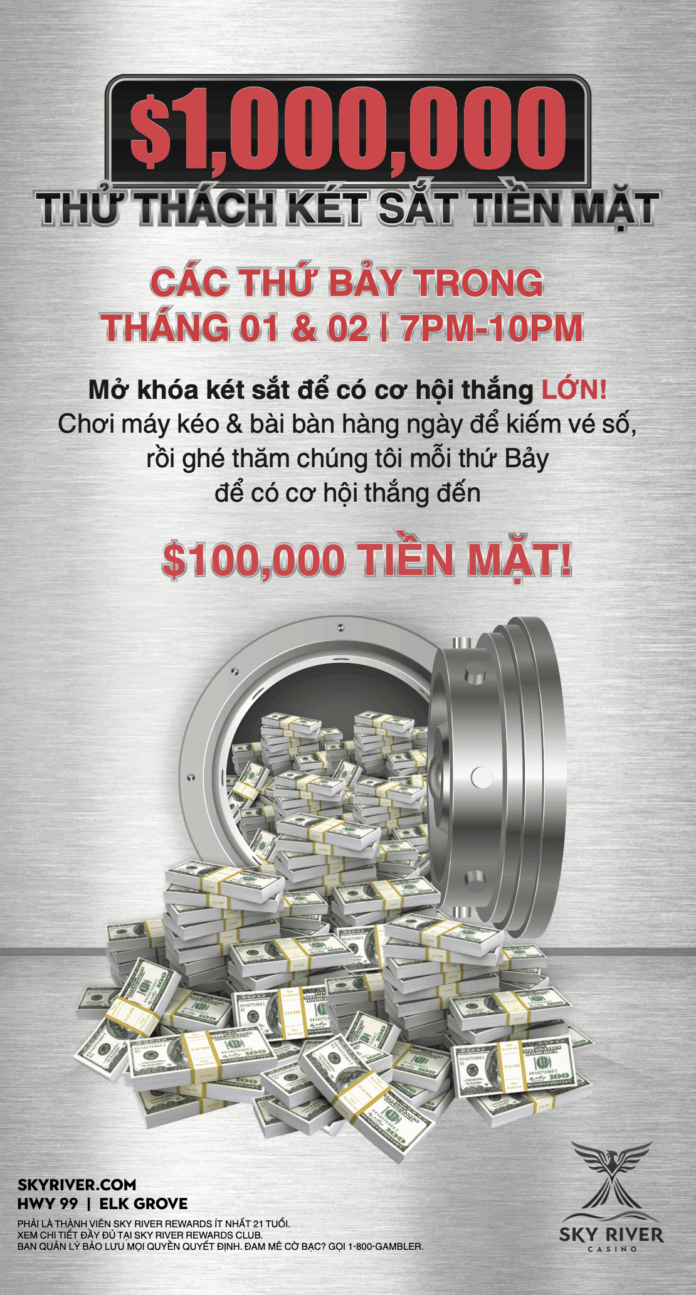 Elk Grove, CA – Sky River Casino mở màn năm 2026 với Thử Thách Két Sắt Tiền Mặt $1,000,000, một chương trình khuyến mãi kéo dài tám tuần diễn ra mỗi thứ Bảy từ ngày 03 tháng 01 đến ngày 28 tháng 02, mang đến cơ hội trúng thưởng lên tới $100,000 tiền mặt trong một lần xổ số. Sòng bài cũng sẽ chào mừng tết Nguyên đán với màn biểu diễn múa lân truyền thống vào Chủ nhật, ngày 15 tháng 02, cùng thực đơn đặc biệt tám món độc quyền tại Dragon Beaux với các món ăn mừng truyền thống đặc trưng cho ngày lễ.