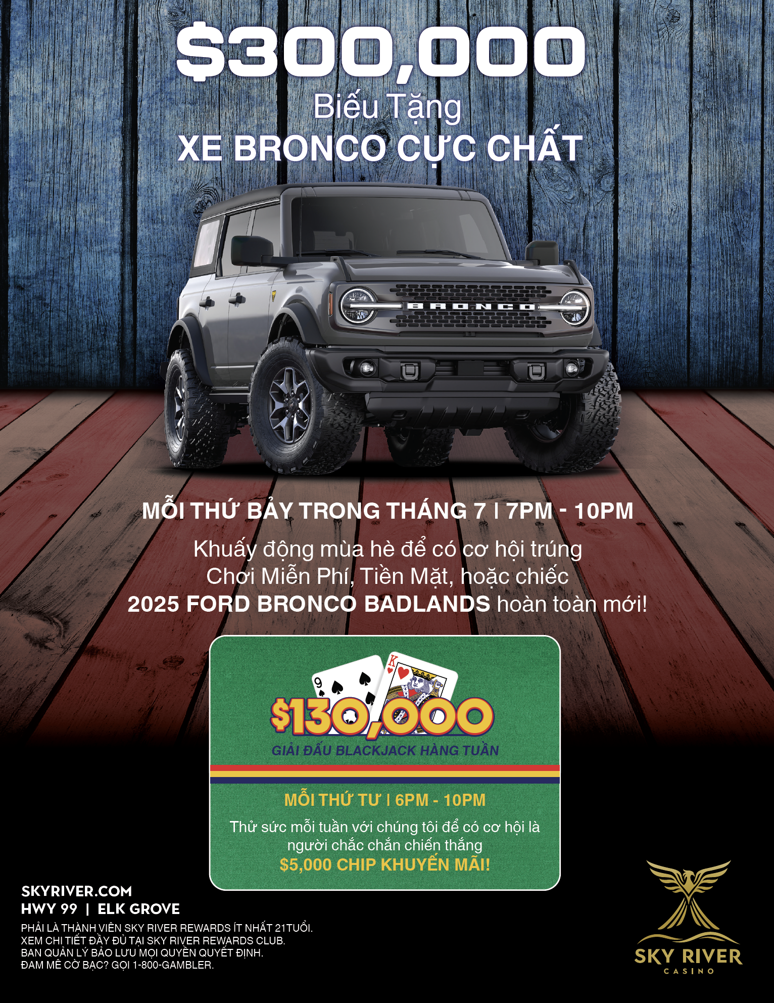 Chương trình Biếu Tặng Xe Bronco Cực Chất trị giá $300,000 diễn ra vào mỗi thứ Bảy trong tháng Bảy từ 7:00PM đến 10:00PM, tạo nhiều cơ hội cho các thành viên Sky River Rewards tham gia. Người chơi có thể kiếm vé số hàng ngày bằng cách chơi các máy kéo và bài bàn với thẻ Rewards, kèm một vé số miễn phí mỗi ngày khi quẹt thẻ tại các kiosk khuyến mãi trong toàn sòng bạc. Thành viên cũng có thể nhận 100 vé thưởng mỗi thứ Hai và thứ Ba bằng cách tích lũy 100 Tín Dụng Cấp Bậc và quy đổi chúng tại kiosk khuyến mãi.