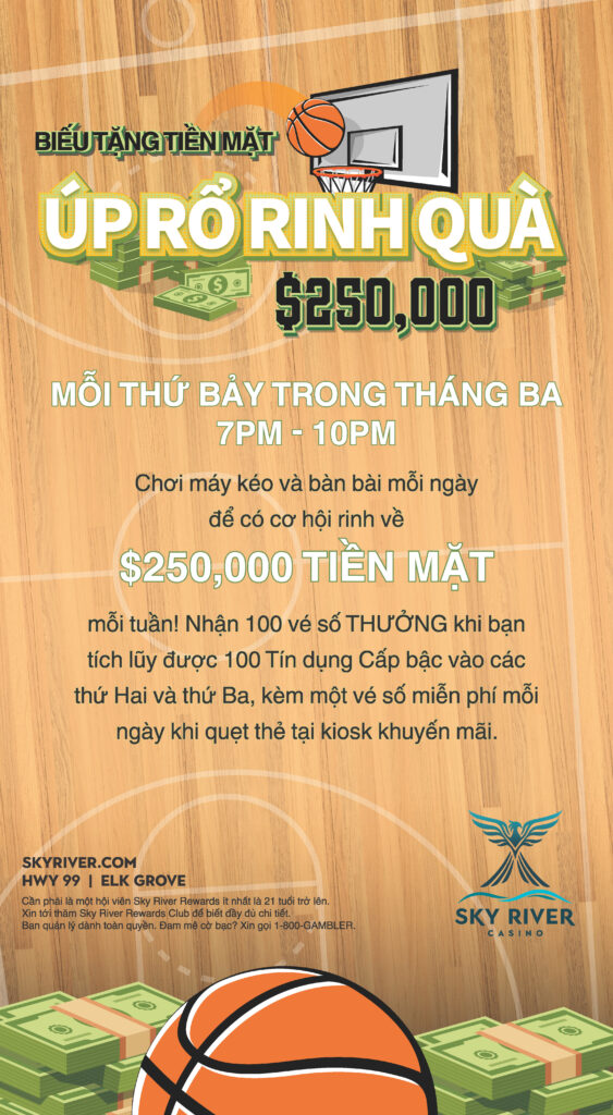 Mỗi thứ Bảy trong tháng Ba từ 7PM đến 10PM, Sky River Casino tổ chức Biếu tặng Tiền mặt Úp Rổ Rinh Quà $250,000. Các buổi xổ số được tổ chức mỗi 30 phút, nơi các thành viên Sky River Rewards được chọn sẽ có cơ hội “ghi bàn thắng” Chơi Miễn phí và các giải thưởng tiền mặt lên đến $250,000. Thành viên có thể kiếm vé số vào các buổi xổ số hàng ngày bằng cách chơi máy kéo và bàn bài, kèm nhận một vé số miễn phí mỗi ngày bằng cách quẹt thẻ Sky River Rewards tại kiosk khuyến mãi. Sẽ thưởng thêm 100 vé số khi bạn kiếm được 100 Tín dụng Cấp bậc vào các ngày thứ Hai và thứ Ba trong thời gian diễn ra chương trình khuyến mãi.