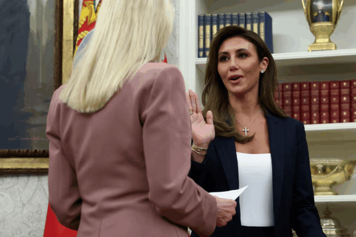 Alina Habba tuyên thệ nhậm chức Luật sư Hoa Kỳ tạm thời cho Quận New Jersey bởi Tổng chưởng lý Hoa Kỳ Pam Bondi, tại Phòng Bầu dục ở Tòa Bạch Ốc ở Washington, DC, Hoa Kỳ, ngày 28 tháng 3 năm 2025. REUTERS/Evelyn Hockstein/Ảnh lưu trữ Mua Quyền cấp phép
