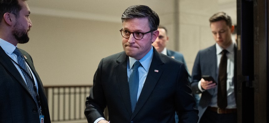 Chủ tịch Hạ viện Mike Johnson, Đảng Cộng hòa-La., đến dự họp báo sau cuộc họp của Hội nghị Đảng Cộng hòa tại Hạ viện vào ngày 17 tháng 12 năm 2024. Johnson đang cố gắng xây dựng một thỏa thuận tài trợ mới để ngăn chặn việc chính phủ liên bang đóng cửa vào thứ Bảy. Tom Williams / Getty Images