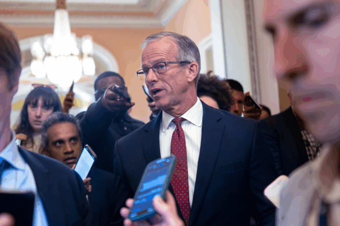Lãnh đạo đa số Thượng viện John thune, r.s.d., dừng lại ở cửa văn phòng của mình để phát biểu với các phóng viên vào ngày thứ 20 của thời gian chính phủ đóng cửa, tại Điện Capitol ở Washington, Thứ hai, ngày 20 tháng 10 năm 2025. (ảnh ap/j. scott applewhite)