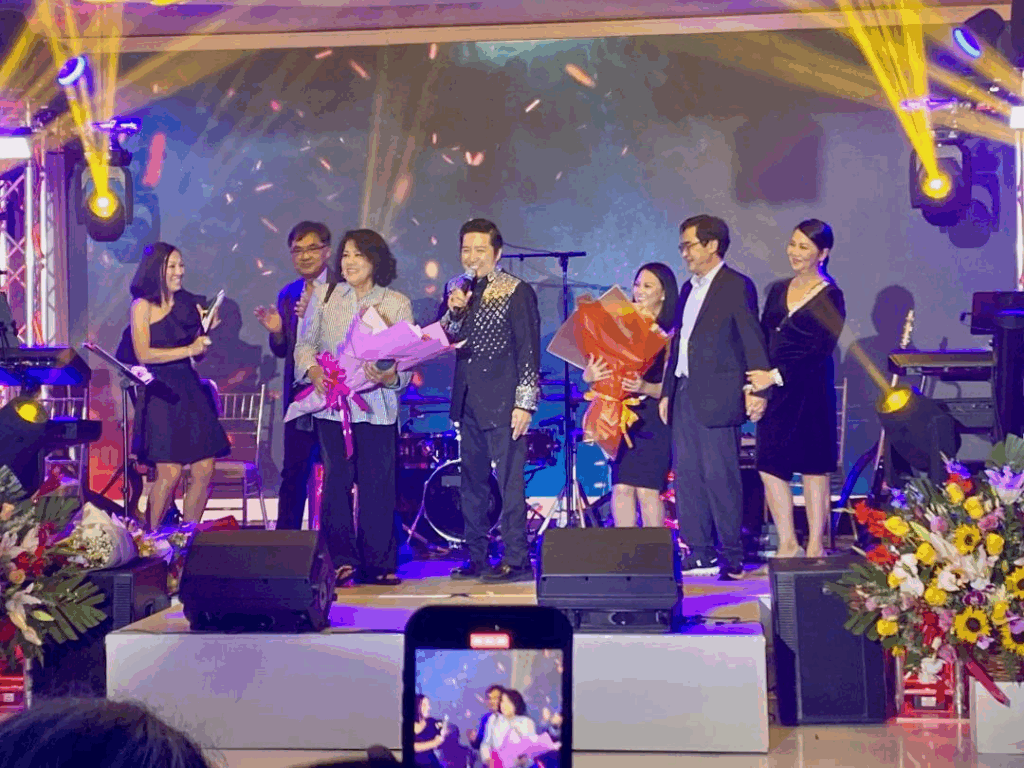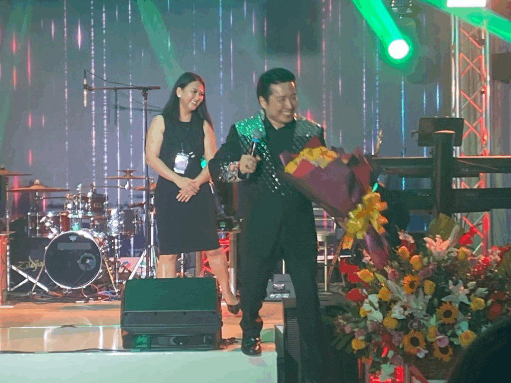 Ông bà Huỳnh Thi-Tô Ngọc Thủy- giám đốc Trung Tâm Thúy Nga; nhạc sĩ Trúc Hồ- Diệu Quyên giám đốc âm nhạc trung tâm Asia lên sân khấu chúc mừng ca sĩ Thế Sơn.