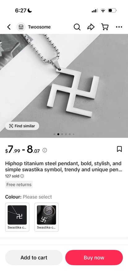 Sản phẩm – được mô tả là “mặt dây chuyền thép titan phong cách hiphop” – nhanh chóng gây phẫn nộ khi nhiều người chất vấn vì sao một biểu tượng gắn liền với Đức Quốc xã lại được bày bán trên nền tảng. Mặt dây chuyền bạc, giá khoảng 8 USD, được người bán miêu tả là “biểu tượng swastika đơn giản… phù hợp cho cả nam và nữ, hợp thời và mang tính dòng ngách.”