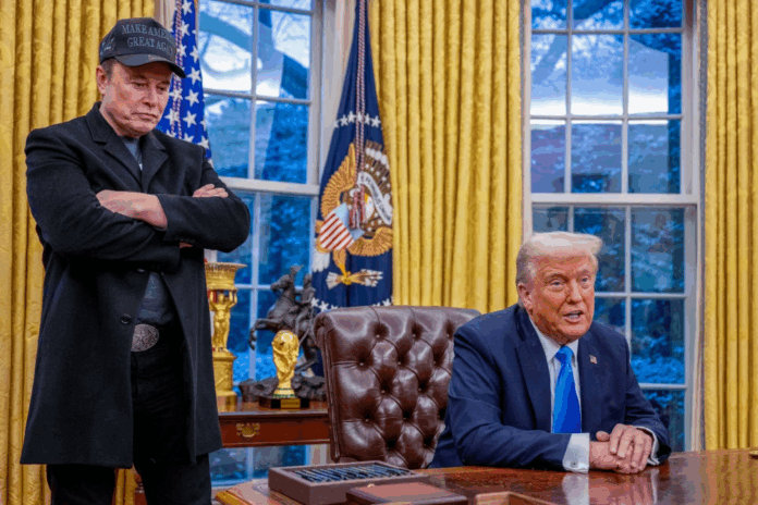 Elon Musk lắng nghe Tổng thống Donald Trump phát biểu tại Phòng Bầu dục vào ngày 11 tháng 2 năm 2025.Jim Watson / AFP - Tập tin hình ảnh Getty