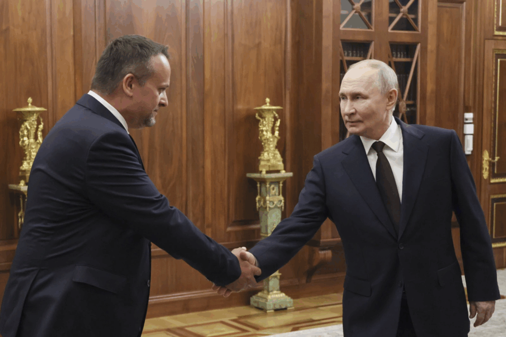Tổng thống Nga Vladimir Putin, bên phải, bắt tay Bộ trưởng Giao thông vận tải tạm quyền mới được bổ nhiệm Andrey Nikitin trong cuộc họp của họ tại Điện Kremlin ở Moscow, Nga, Thứ Hai, ngày 7 tháng 7 năm 2025. (Mikhail Metzel, Sputnik, Kremlin Pool Photo qua AP)