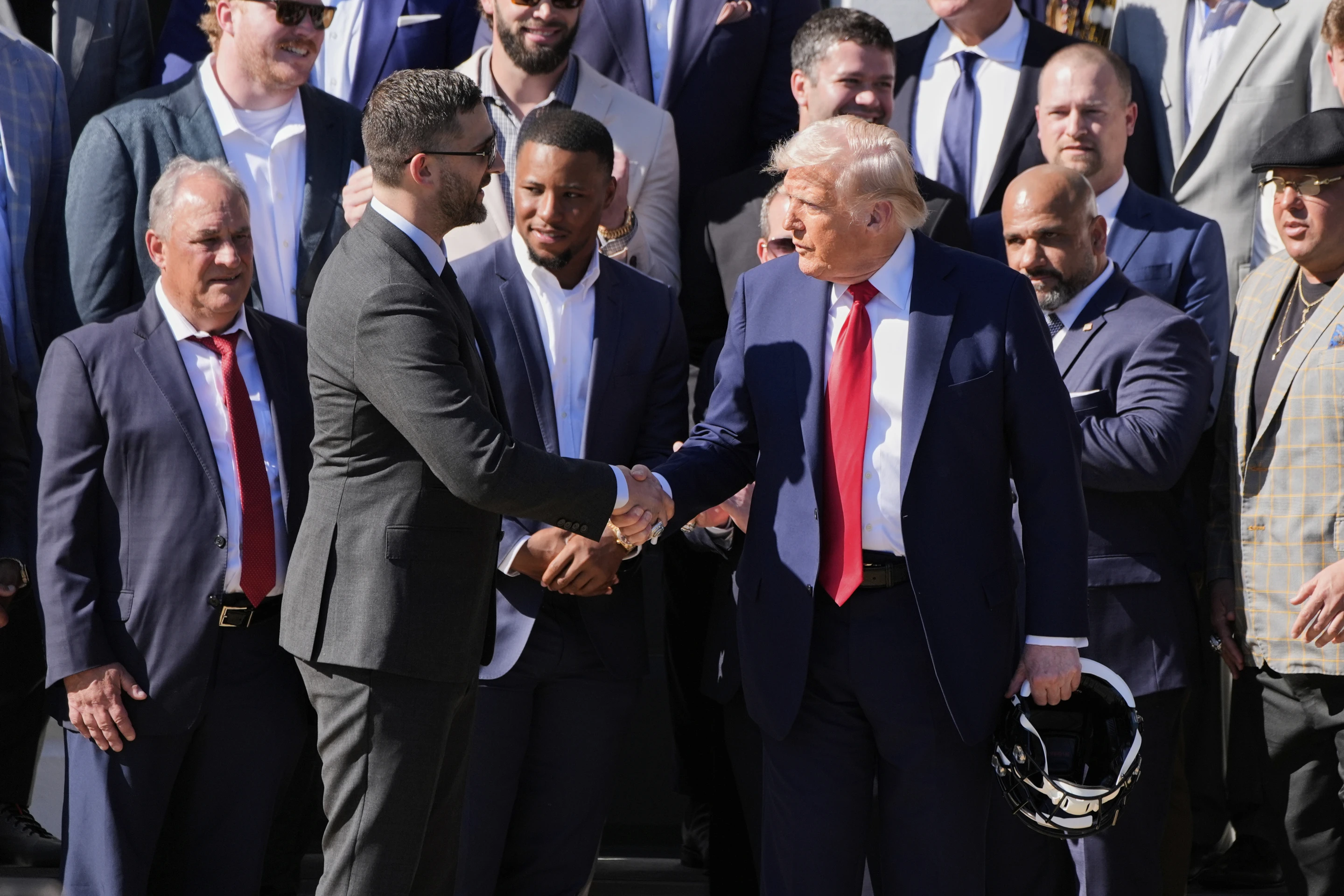 Tổng thống Donald Trump, bên phải, bắt tay huấn luyện viên Nick Sirianni của đội Philadelphia Eagles, khi Trump chào đón bóng bầu dục NEL vô địch Super Bowl đến Bãi cỏ phía Nam của Tòa Bạch Ốc, thứ hai, ngày 28 tháng 04 năm 2025, tại Washington. (Ảnh AP/Alex Brondon)