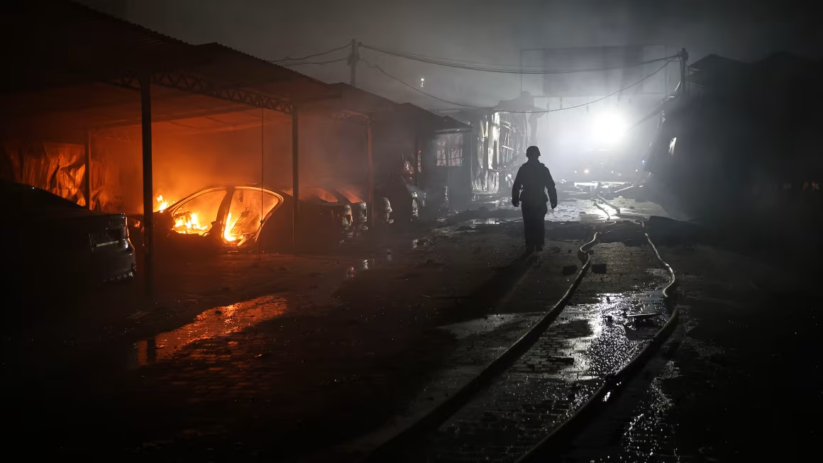Một nhân viên cứu hộ đi bộ trên bãi đậu xe của một dịch vụ sửa chữa ô tô bị phá hủy bởi cuộc tấn công bằng máy bay không người lái của Nga ở Zaporizhzhia, Ukraine, vào ngày 18 tháng 6. Kateryna Klochko/AP