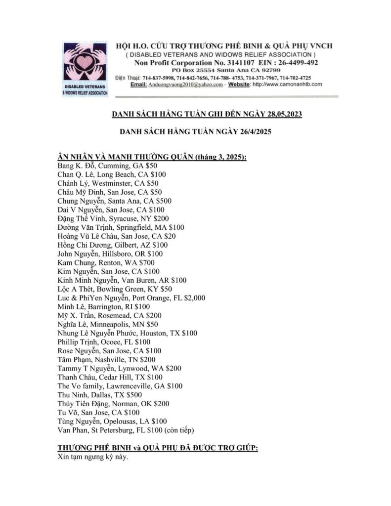 Cộng Đồng Danh Sách Ân Nhân Gởi Tiền cho Hội HO cứu trợ Thương Phế Binh hằng tuần – 26/4/2025 By admin - April 28, 2025 0 602 FacebookTwitterEmailPrintTelegramViberCopy URL