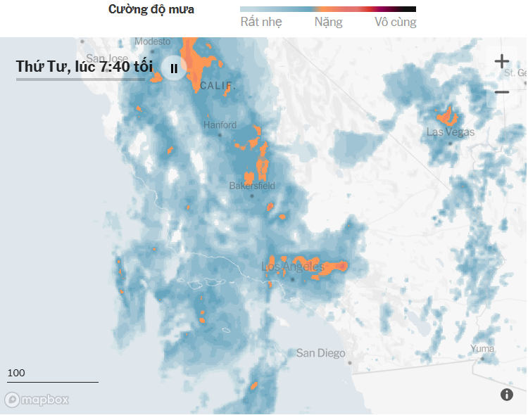 Thống đốc Gavin Newsom ban bố tình trạng khẩn cấp tại sáu hạt, gồm Los Angeles, Orange và San Diego. Cơ quan Khí tượng Quốc gia báo cáo 6–8 inch mưa tại San Diego tính đến chiều thứ Tư — và dự kiến còn tăng.