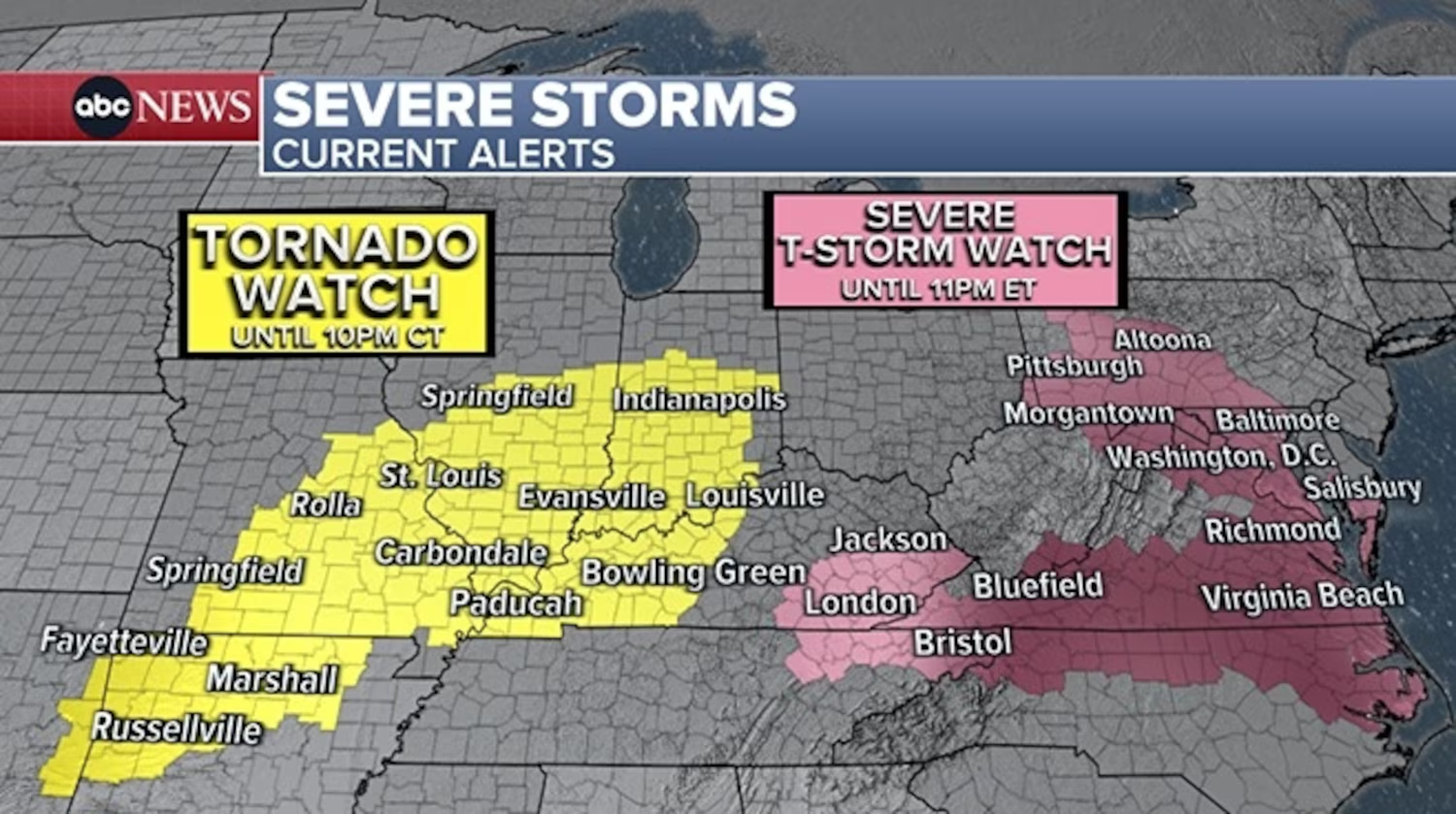 Một cảnh báo lốc xoáy đang có hiệu lực tại Indianapolis, Louisville (Kentucky), và Carbondale (Illinois) cùng nhiều thành phố khác đến 10 giờ tối theo giờ Trung Mỹ (CT).